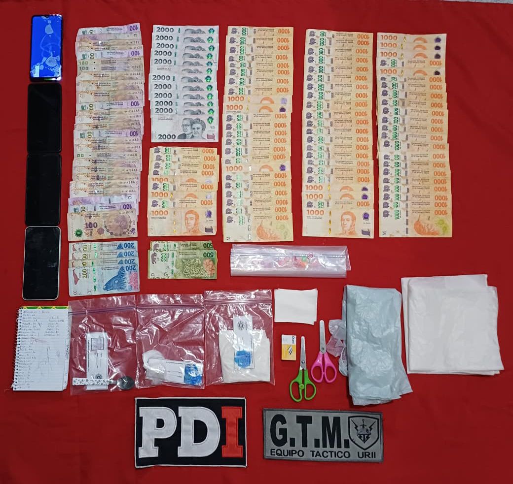 Durante las diligencias, los efectivos secuestraron 52,93 gramos de cocaína, 15 teléfonos celulares, $1.286.550 en efectivo, dos armas de fuego calibre .22 LR marca Bersa, dos cargadores, 58 cartuchos del mismo calibre, un automóvil Peugeot 206, una libreta de anotaciones, recortes varios, bandas elásticas, broches metálicos y una cuchara con vestigios de cocaína.