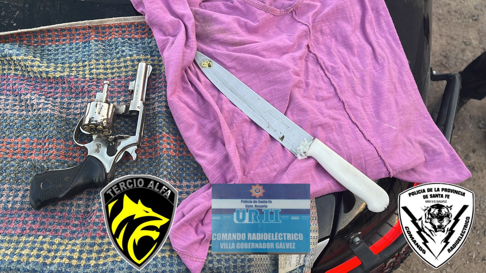 Al solicitarle que levantara la remera, se constató que llevaba un bolso tipo bandolera, en cuyo interior se halló un revólver calibre 22 largo, con ocho alveolos intactos, además de un cuchillo tipo carnicero de aproximadamente 30 centímetros de hoja. Ante esta situación, se procedió a la aprehensión de la mujer y al secuestro de los elementos, en presencia de testigos.