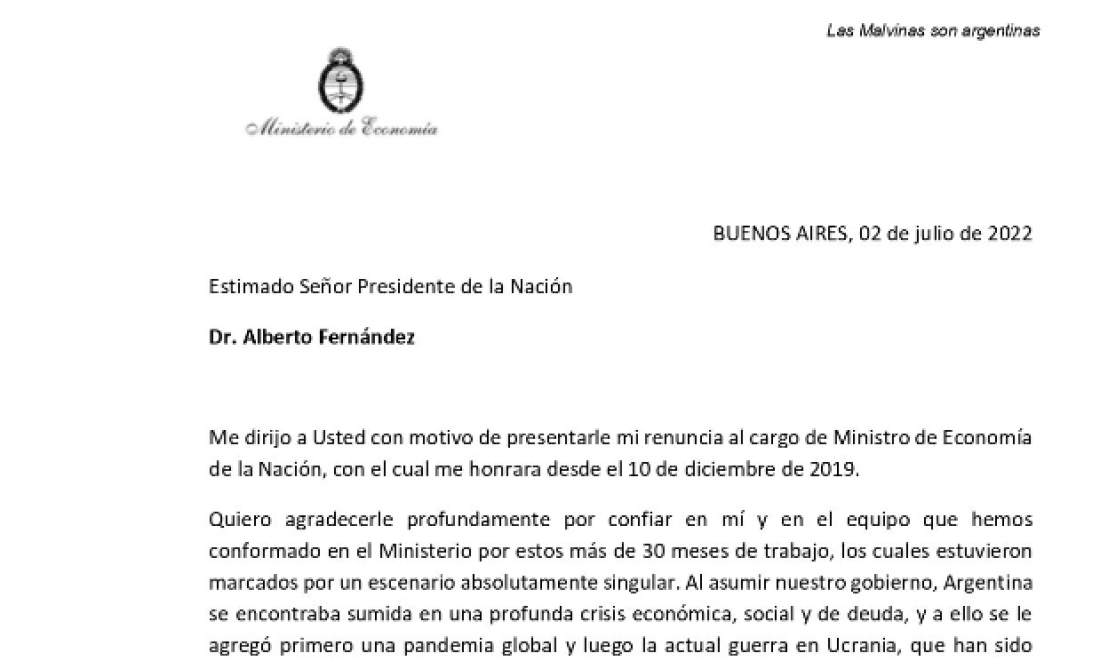 Martín Guzmán renunció a su cargo como ministro de Economía, en una carta dirigida al presidente Alberto Fernández publicada esta tarde en su cuenta de la red social Twitter.