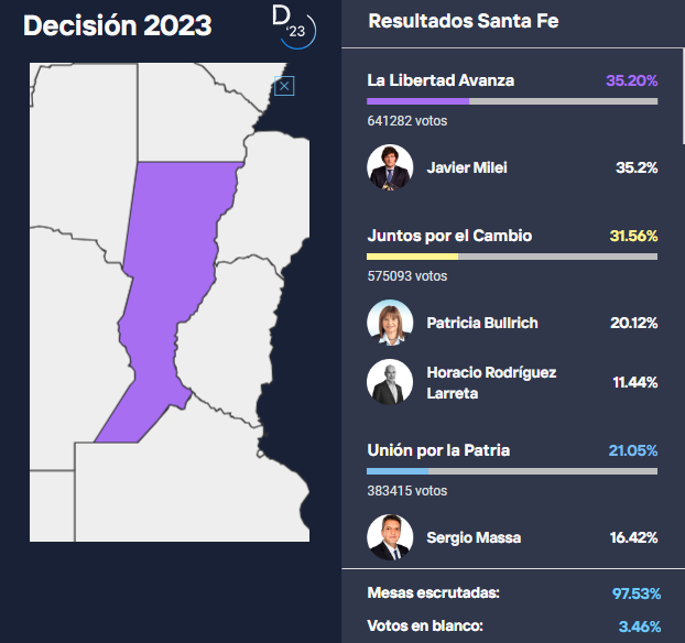 Con el 35,28% de los votos, Javier Milei es el candidato más votado en la provincia de Santa Fe con el 91,92% de las mesas escrutadas. A este resultado le siguen