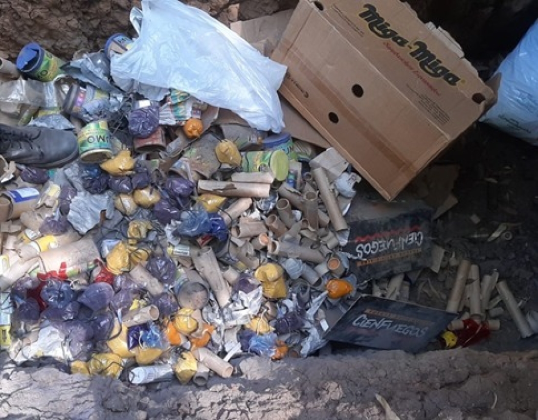Dicho material se encontraba en depósito siendo: una torta pirotécnica de 48 tiros, una bengala de señalización, una torta pirotécnica de 100 tiros, diez bengalas iluminantes, cinco bombas de estruendo, 49 potes de humo azul y amarillo, dos tortas pirotécnicas de 25 tiros, treinta y un petardos y una bomba de estruendo semi combustionada.